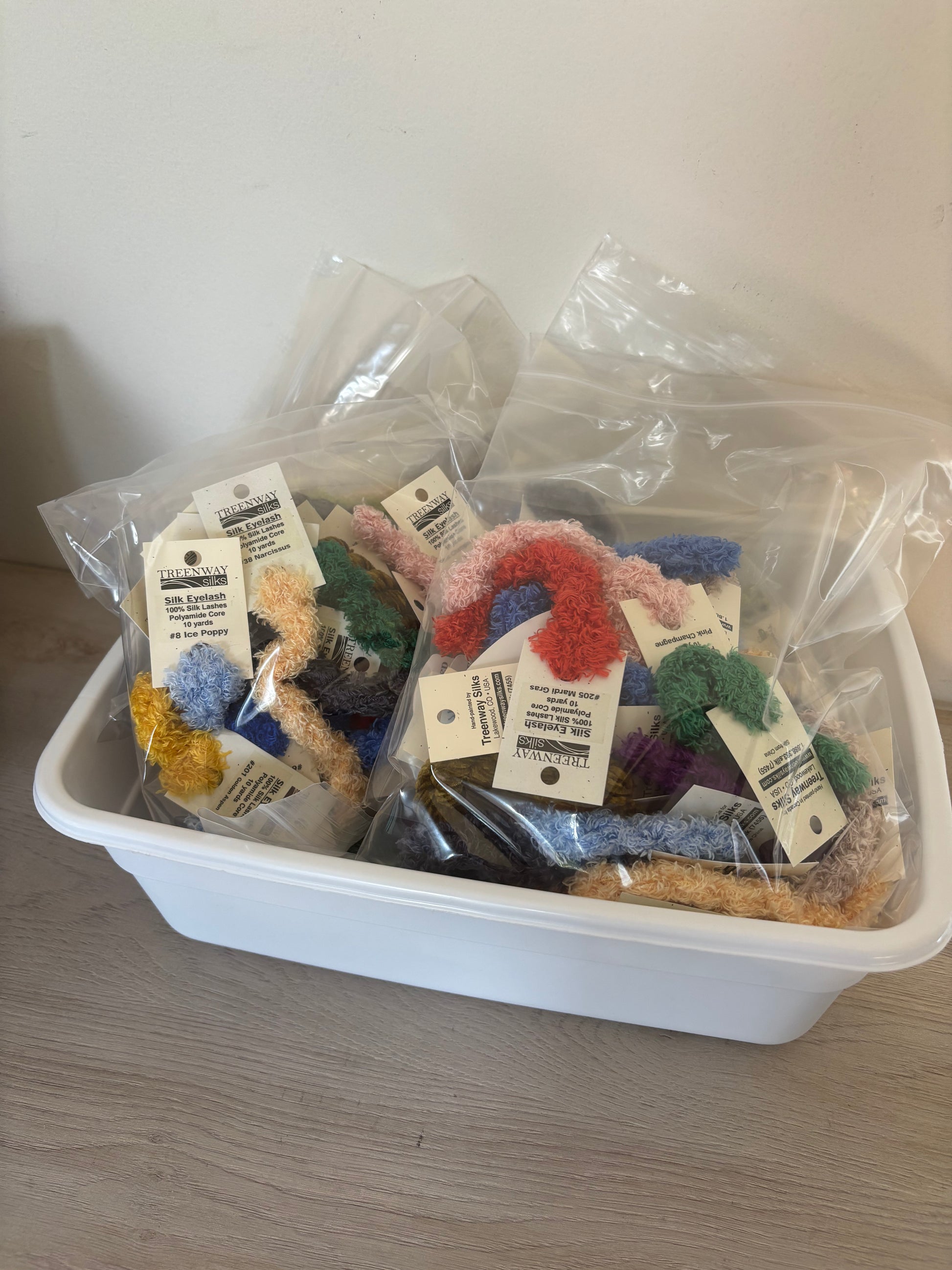 We've collected lots of fuzzy threads that we are no longer carrying - and you get a good deal! Each bag has 20 skeins and has mostly Treenway Eyelash plus a few other goodies - maybe alpaca, maybe chenille, maybe shaded very velvet! Every bag is different so it'll be a fun surprise!
