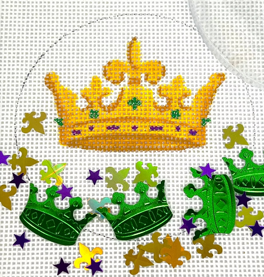 Canvas is 3" round on 18 mesh. Includes coordinating confetti and the plastic dome.